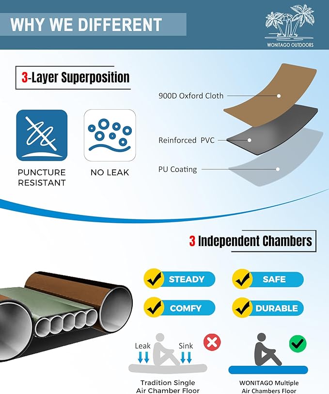 - HIGH-QUALITY INFLATABLE KAYAK --- Made of durable PVC material covered with Oxford cloth outside, providing better performance than ordinary PVC inflatable kayaks. With this durable material, you can be confident that our touring kayak will last for many adventures to come