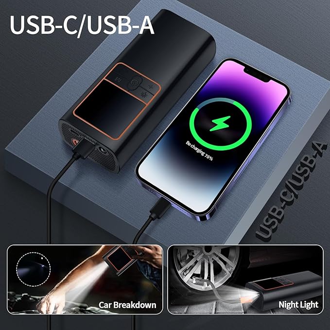 - 【Tire Inflator Air Compressor】Lightweight air pump,USB-C input port and USB-A output port, can be reversed to power. A suitable gift for Father's Day, Christmas, New Year and other.
