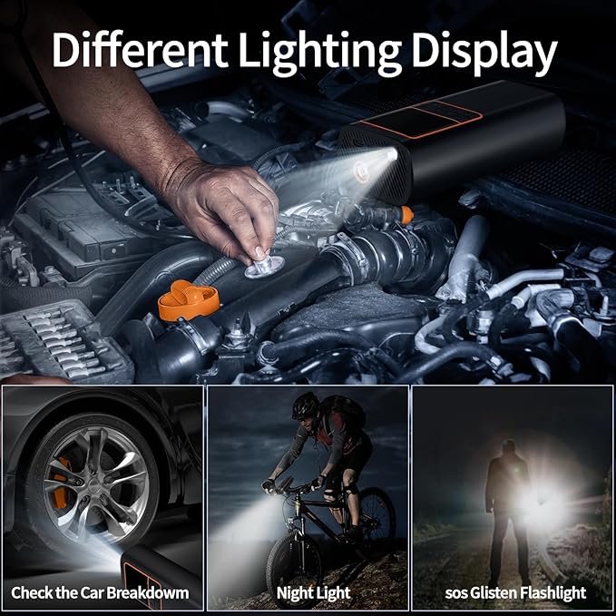 - 【Safe Auto Off】Tire Inflator clear screen with tire pressure gauge feature. Dual values for easy read pressure preset value and real-time pressure value, measurement accuracy ±1 PSI for safer inflation. 3 kinds of lights, LED, SOS, flashing lights, for the dark night and emergency situations , Add security to your journey