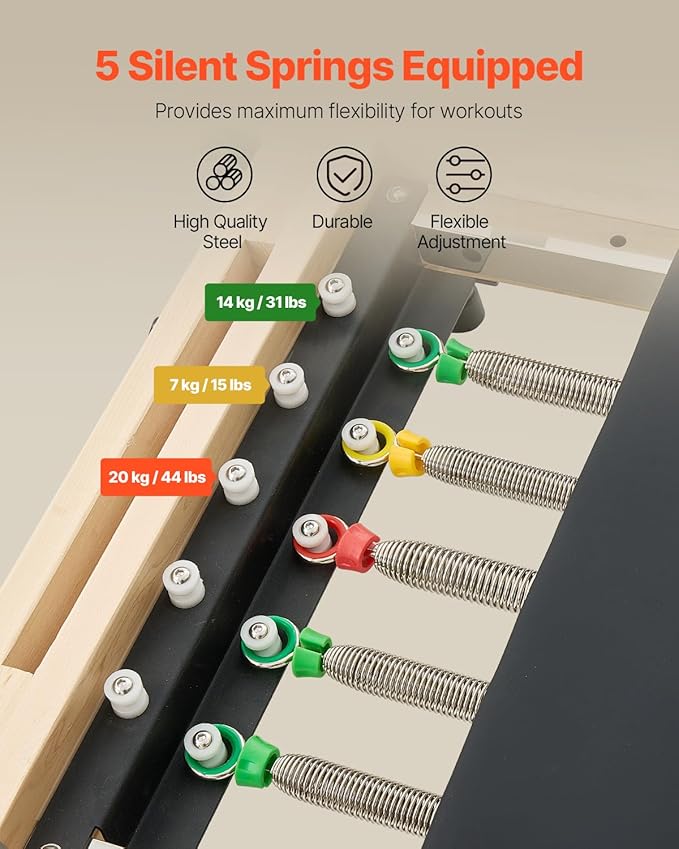 - Premium Springs: With high-quality spring steel, this home workout pilates equipment offers 5 levels of spring resistance, ideal for working your upper body, lower body, and core muscles. The set includes 1 strong spring (red), 3 medium springs (green), and 1 light spring (yellow)