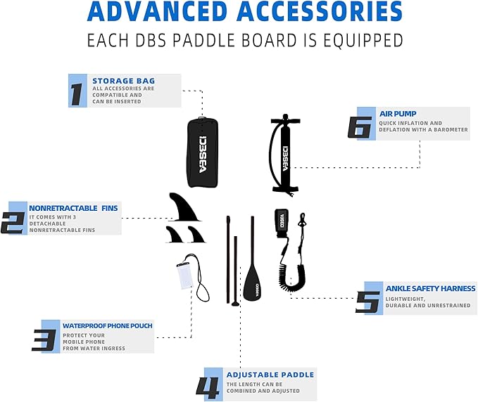 - 【Complete Accessory Set】 Includes adjustable paddle, 3 detachable fins including 1 center fin and 2 side fins, ankle leash, waterproof phone pouch, dual-action high-efficiency pump (inflates in 10 min), camera mount, large-capacity carry backpack, and user manual