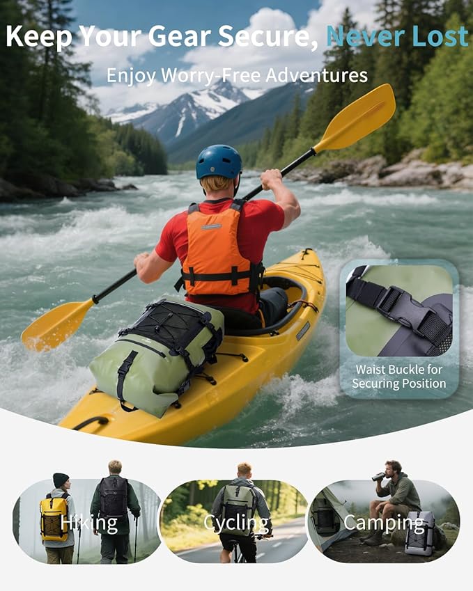 - 【Quick Waterproof System】 Ecohub waterproof backpack designed with a roll-top closure and single reinforced strip to ensure water stays out. Align the straps on the top of the waterproof dry backpack after stores your gear, simply fold the bag down 3-4 times, buckle, and you are ready to go!
