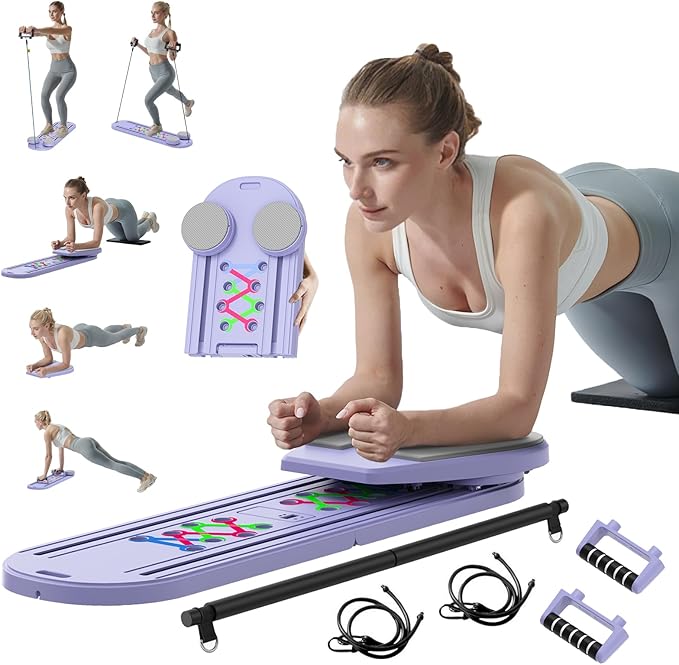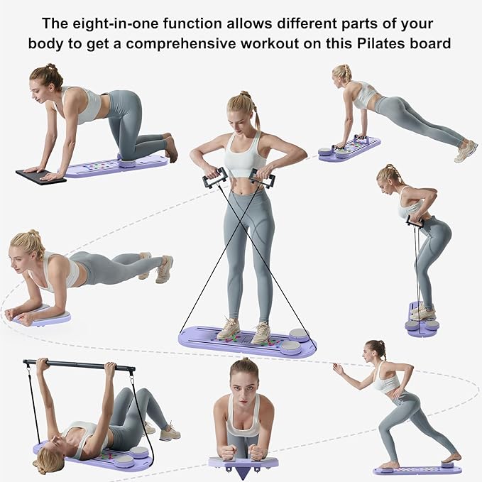 - Experience total-body fitness with the multi-functional Pilates Reformer Board, integrating Pilates, ab wheel exercises, push-up handles, resistance bands, and balance board capabilities for efficient shaping, fat burning, and stamina enhancement across core, hips, legs, and arms