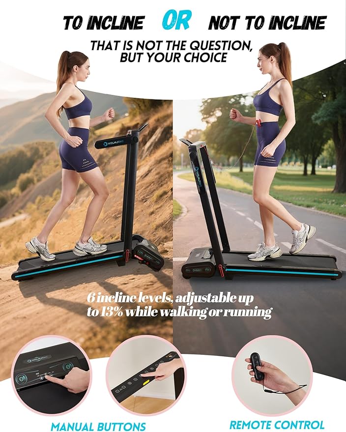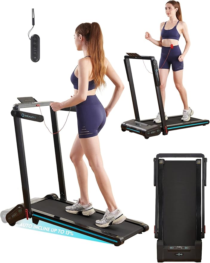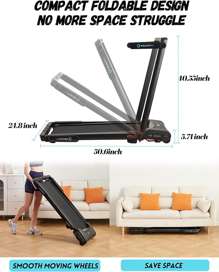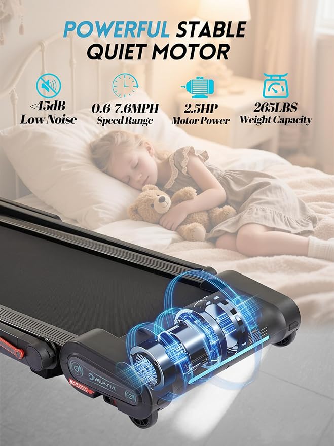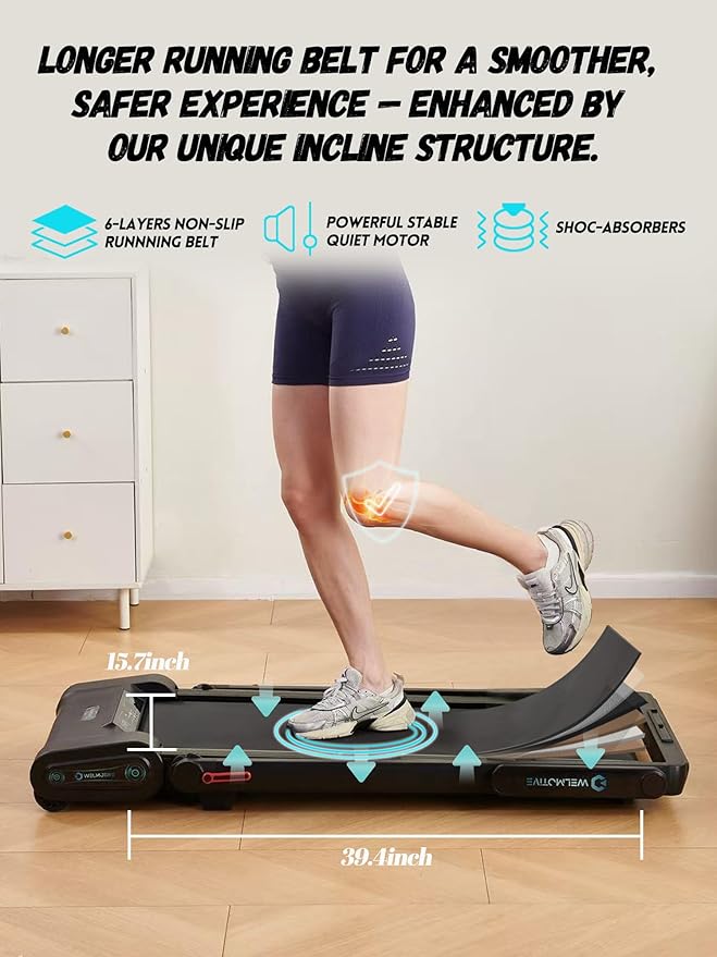 - ⛰️ Exclusive Fold-Up Incline Design – More Than Just a Walking Pad: The Welmotive walking pad features a unique fold-up front structure that activates incline mode when raised. This patented design transforms flat walking into a challenging uphill workout—something most compact treadmills can’t offer.