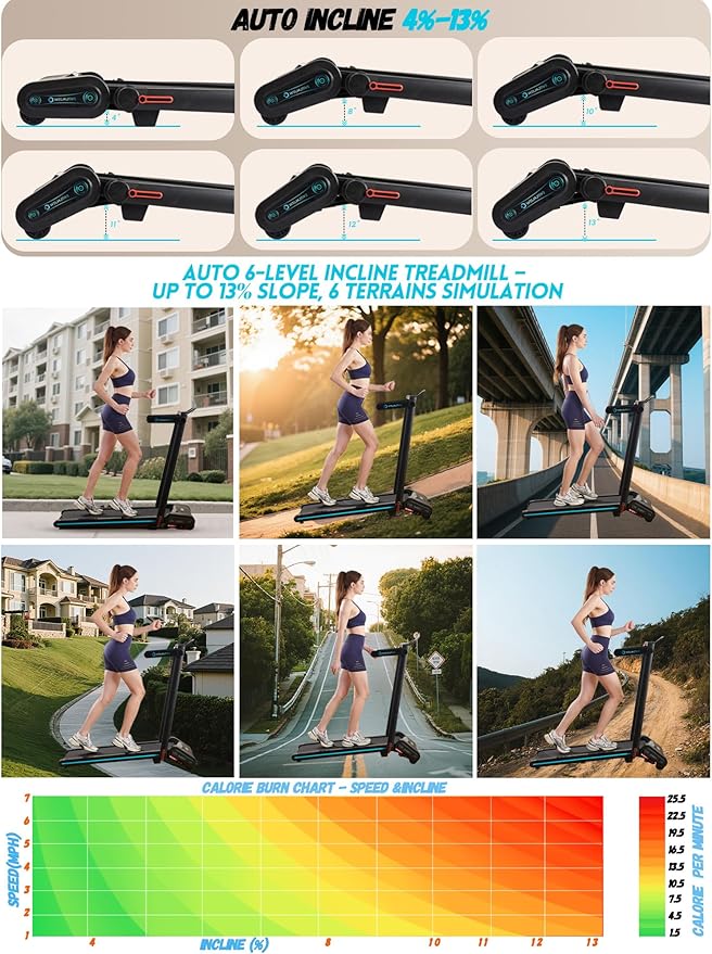 - 🔥 6-Level Auto Incline for Fat Burn & Muscle Tone: Train smarter with six incline levels (4%, 8%, 10%, 11%, 12%, 13%) that simulate uphill terrain. Perfect for burning more calories, strengthening your core and legs, and pushing your limits—all from the comfort of home.