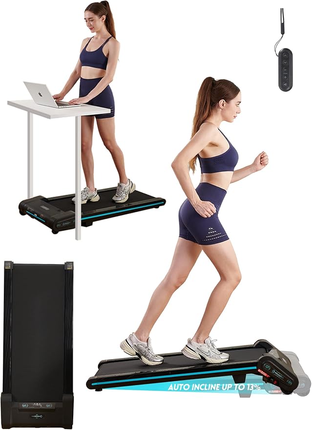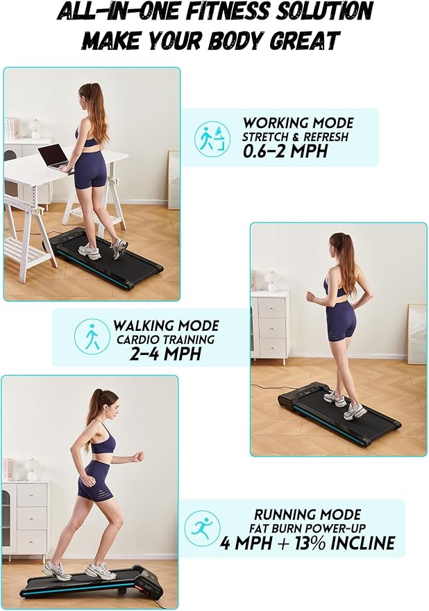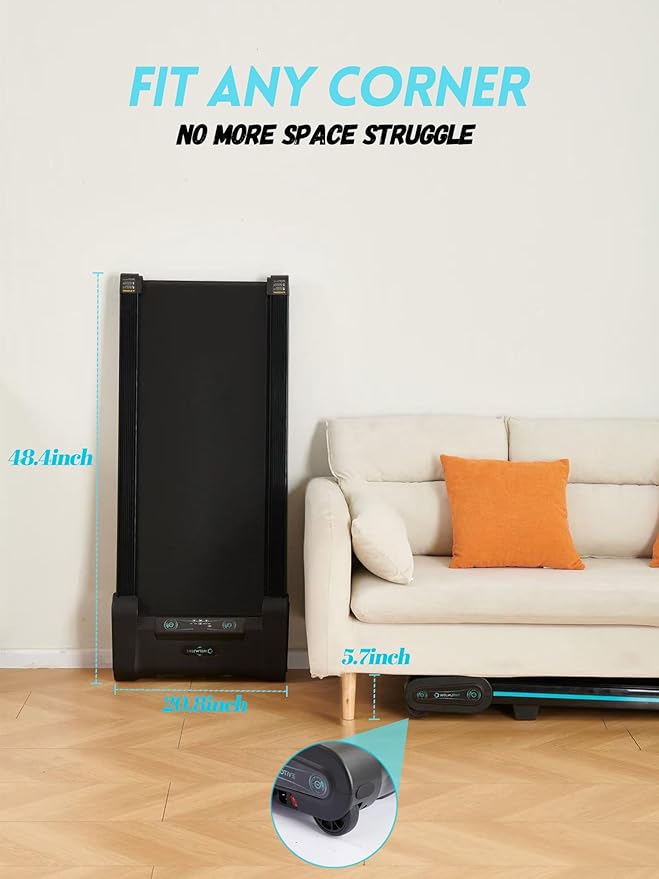 - 🛋️Space-Saving with Built-In Transport Wheels: Slim and portable, this treadmill folds to just 5.7" high and includes integrated wheels—making it easy to store under a bed, behind a door, or in a corner. Ideal for small spaces, home offices, and apartments.