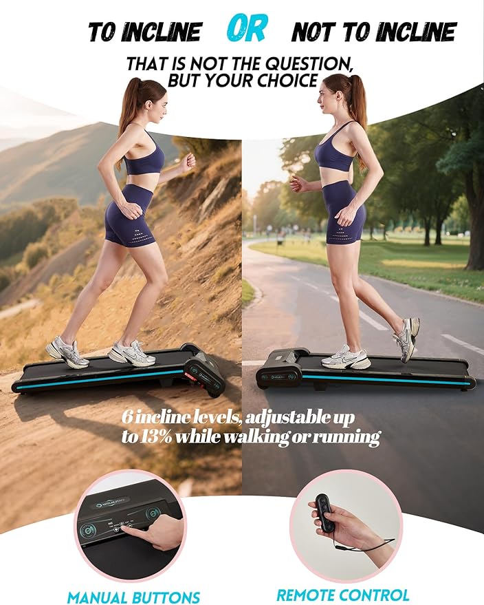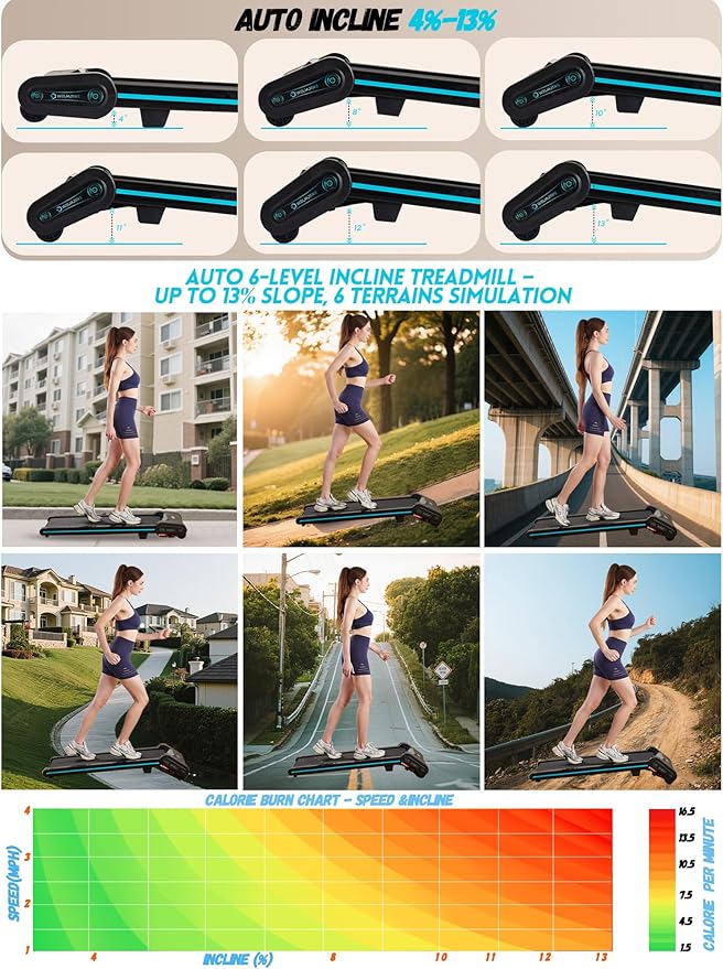 - 📈 6-Level Auto Incline for Customized Challenge: Push your limits with six auto incline levels (4%–13%), simulating everything from a light hill to a steep climb. This adjustable incline helps you burn more calories, target lower-body muscles, and break through fitness plateaus—perfect for beginners to seasoned athletes.