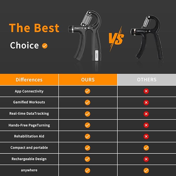 - YOUR PERSONAL GRIP STRENGTH TESTER: Go beyond a standard grip trainer with our smart app. This device functions like a digital hand grip dynamometer, allowing you to accurately track your progress. Gamified modes make it engaging training equipment for athletes and fitness enthusiasts alike.