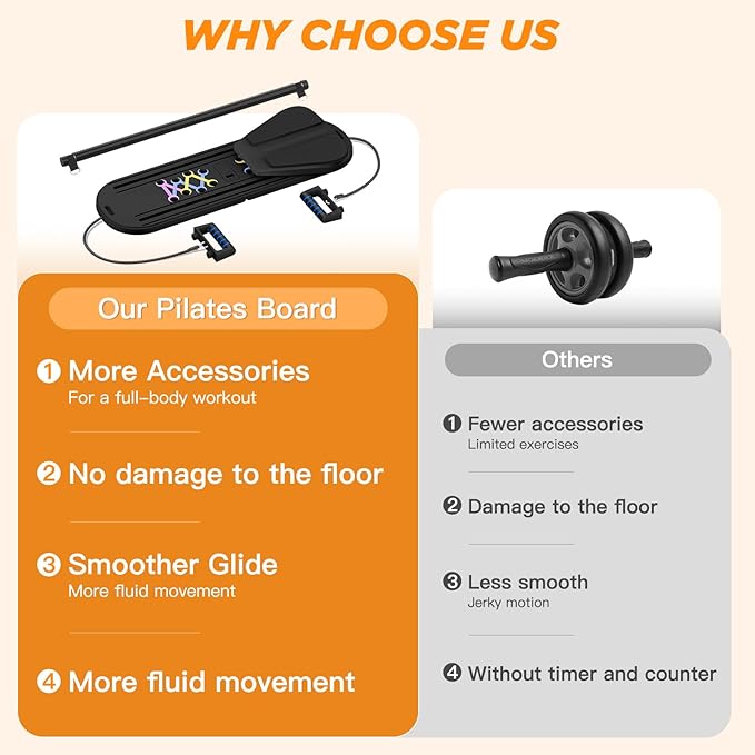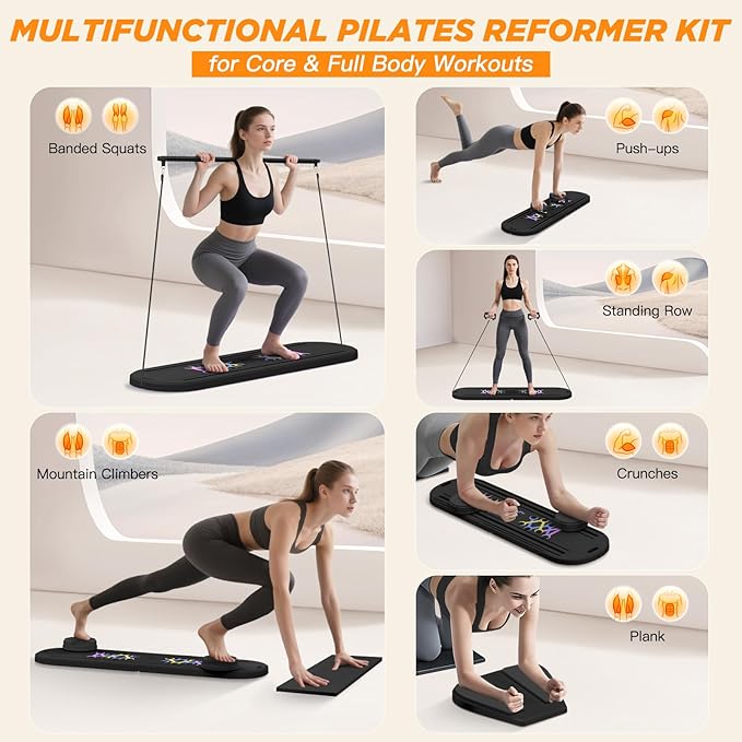 - 【MULTIFUNCTIONAL PILATES REFORMER SET】Our pilates reformer set combines the function of pilates board, ab roller wheel, resistance bands, push-up handles, balance board and planks.Whether you're a pilates equipment beginner or advanced pilate fitness enthusiast, Perfect for full body workout for body shaping, fat loss, and improving body function and flexibility. GREAT FOR BEGINNERS OR ANYONE ON A BUDGET LOOKING TO ELEVATE THEIR WORKOUT ROUTINE