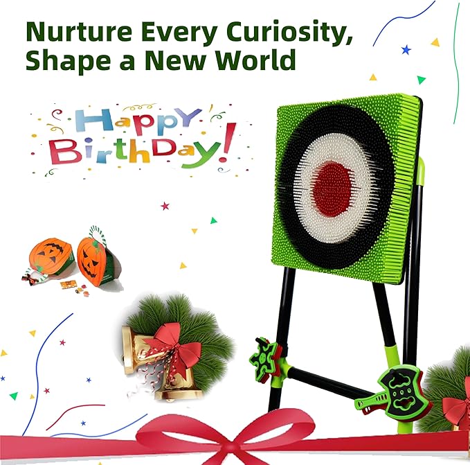 - Durable & Weatherproof Design: Our target board is crafted with advanced Weather Resistance, Constructed with PP material (CPSIA & ASTM F963 Certified, no rust or PVC!). The triangular base ensures stability, while included 2 steel ground stakes (6.1" length) secure it on uneven terrain. Portable-Weighs only 10.5lbs yet sturdy, for backyard, camping, or indoor games