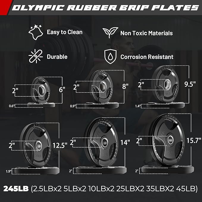 - 【245LB Barbell Set】The set includes a 6-foot barbell with a pair of collars and a set of 245b weight plates: 2x2.5lb, 2x5lb, 2x10lb, 2x25lb, 2x35lb, 2x45lb. With the barbell included, the total weight adds up to 275lb. These cost-effective equipment are perfect for long-term training use.