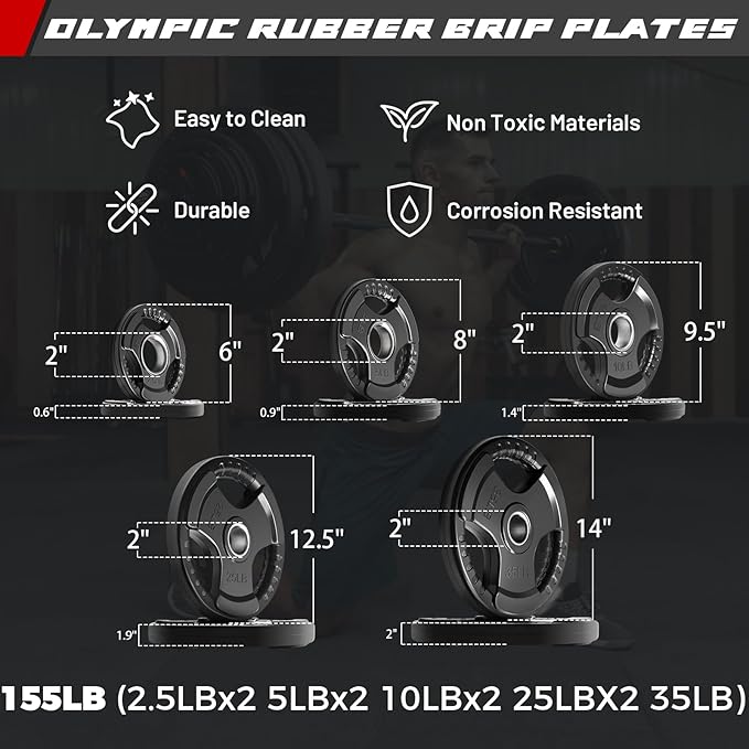 - 【155LB Barbell Set】The set includes a 6-foot barbell with a pair of collars and a set of 155lb weight plates: 2x2.5lb, 2x5lb, 2x10lb, 2x25lb, 2x35lb. With the barbell included, the total weight adds up to 185lb. These cost-effective equipment are perfect for long-term training use.