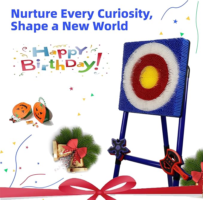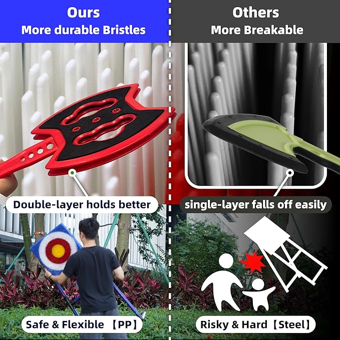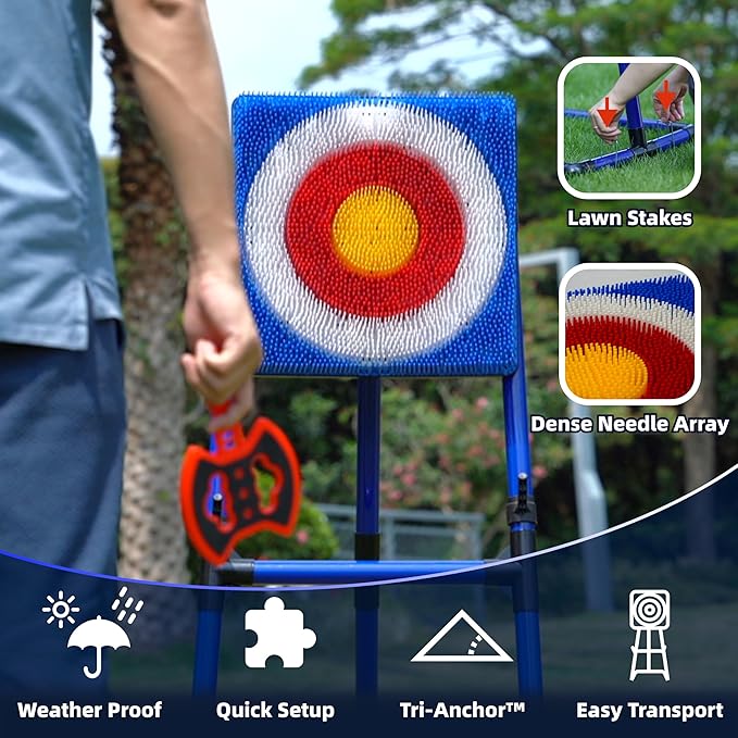 - Durable & Weatherproof Design: Our target board is crafted with advanced Weather Resistance, Constructed with PP material (CPSIA & ASTM F963 Certified, no rust or PVC!). The triangular base ensures stability, while included 2 steel ground stakes (6.1" length) secure it on uneven terrain. Portable-Weighs only 10.5lbs yet sturdy, for backyard, camping, or indoor games.