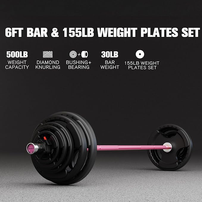 - 【155LB Barbell Set】The set includes a 6-foot barbell with a pair of collars and a set of 155lb weight plates: 2x2.5lb, 2x5lb, 2x10lb, 2x25lb, 2x35lb. With the barbell included, the total weight adds up to 185lb. These cost-effective equipment are perfect for long-term training use.