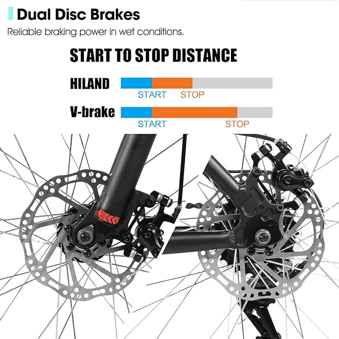 - Brakes And Shifters: Powerful dual disc brakes are more efficient than other brakes, giving you better stopping power for your rough and wet adventures; 18-speed drivetrain allows you to find the higher gear to pursue speed