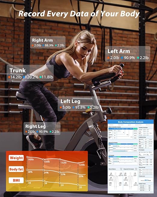 - 46 Body Composition Measurement: Weight scale uses 8-electrode contact technology for full-body measurement across limbs and torso, analyzing body fat, water, muscle mass, bone mass, BMI, and muscle distribution,tracks health and fitness progress with precise body composition data