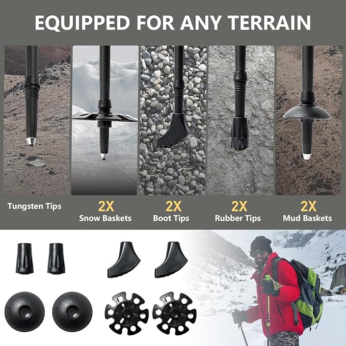 - 【Includes】tungsten-carbide tipped feet for rock scrambling (30% harder than standard steel), quick-change mud baskets for soft terrain, snow baskets for winter expeditions, and protective rubber caps for urban walking. The modular design allows tool-free accessory swaps in seconds to adapt to any environment.If you have any questions about the product or are not satisfied with it, please contact us at any time. We offer you the best solution. Your satisfaction is our main concern.