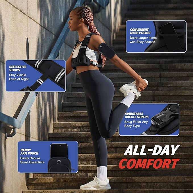 - Convenient & Safe: The odorless adhesive ensures our rucking vest stays secure without irritation or unpleasant smells. The arm pouch holds your essentials, and reflective strips keep you visible and safe during evening or low-light activities