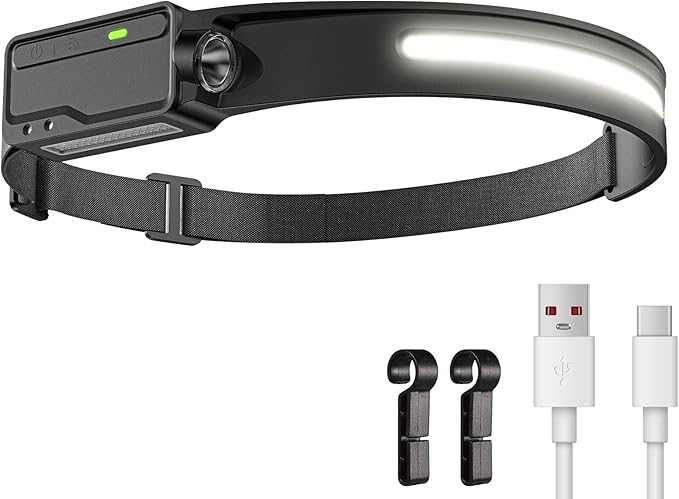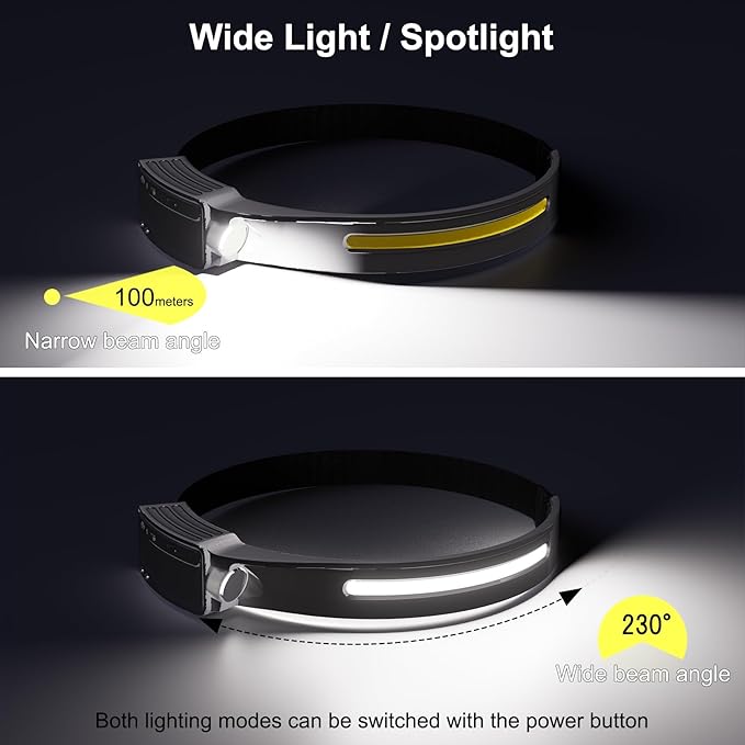 - 【2 Light Sources】The LED headlamp is equipped with a COB light strip floodlight, which provides 230° wide-angle illumination, allowing you to illuminate your field of vision without moving your head. Equipped with super-bright LED lights on the side, the rechargeable headlamp can be used as a spotlight, illuminating a distance of nearly 350 feet.