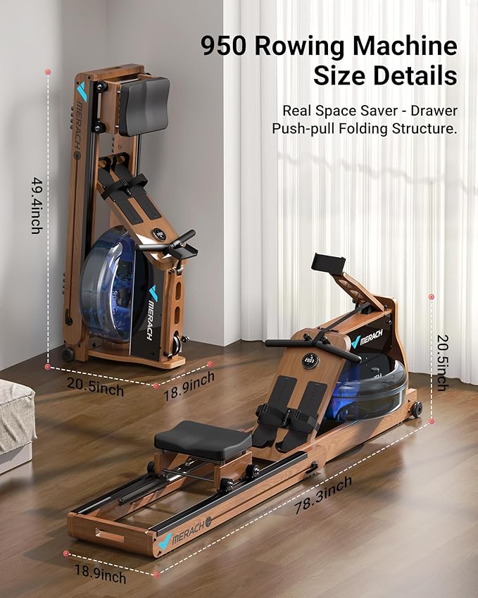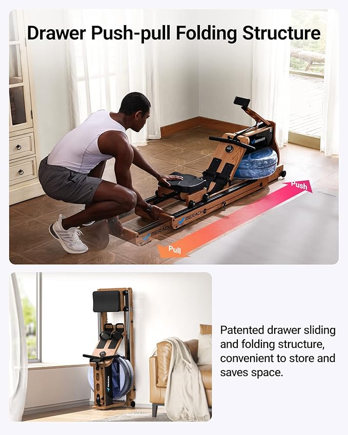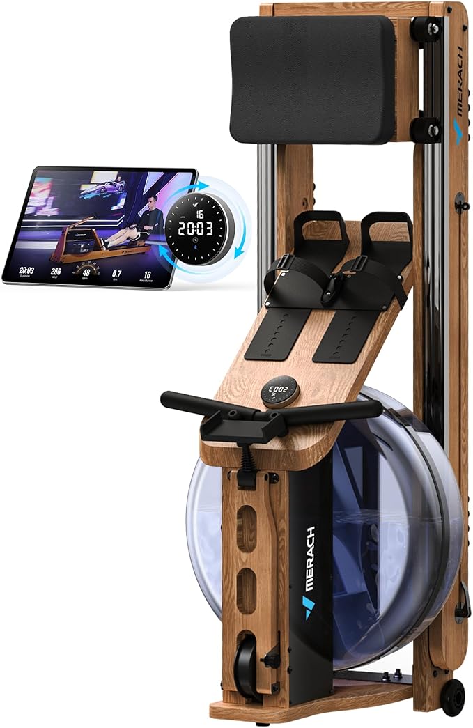 - Premium Solid Wood: The MERACH is handcrafted with high-quality oak wood, and the excellent material absorbed sound and vibration, enhancing the machine's operation and making it smoother and quieter. The patented Oak feature Water Flywheel technology replicates the resistance felt by rowers on the water.
