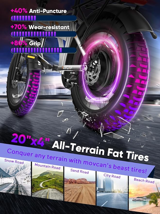- 【20"x4" Multi-Surface Tires & NFC-Enabled Display】Equipped with 20"x4" fat tires, the Movcan Q20 fat tire electric bike for adults provides reliable traction on pavement, packed trails, and wet surfaces. The tread pattern minimizes rolling resistance while preventing debris buildup. A waterproof LCD display shows real-time speed, battery percentage, and distance traveled. NFC card authentication adds theft deterrence. Suitable for year-round commuting in rain or light snow