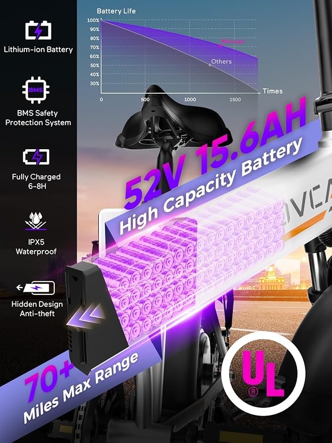 - 【1500W Motor & 52V 15.6Ah Removable Battery for Extended Rides】The Movcan Q20 electric bike for adults integrates a 1500W brushless motor capable of reaching 30MPH with stable acceleration. Powered by a 52V 15.6Ah lithium-ion battery, it delivers 40 miles per charge in pedal-assist mode. The removable hidden battery allows flexible charging at home, office, or public stations. As a foldable electric bike, it maintains robust performance for daily commutes while optimizing energy efficiency