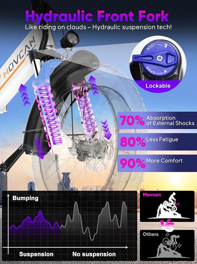 - 【Adjustable Front Suspension & Hydraulic Disc Brakes】The Movcan Q20 electric bike incorporates a travel suspension fork with preload adjustment to absorb urban potholes and curb impacts. Hydraulic dual brakes reduce braking distance by 50% in wet conditions, which greatly reduces bumps during riding and improves riding stability and ensures your safety when enjoying the speed.This folding electric bike prioritizes control during sudden stops or downhill rides
