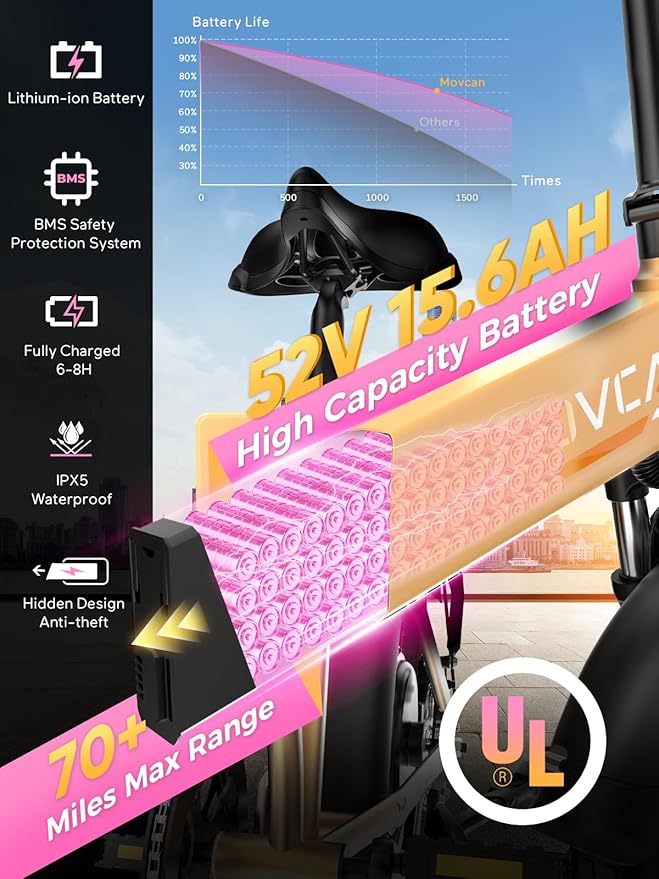 - 【1500W Motor & 52V 15.6Ah Removable Battery for Extended Rides】The Movcan Q20 electric bike for adults integrates a 1500W brushless motor capable of reaching 30MPH with stable acceleration. Powered by a 52V 15.6Ah lithium-ion battery, it delivers 40 miles per charge in pedal-assist mode. The removable hidden battery allows flexible charging at home, office, or public stations. As a foldable electric bike, it maintains robust performance for daily commutes while optimizing energy efficiency