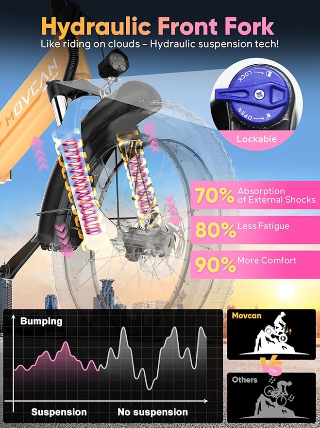 - 【Adjustable Front Suspension & Hydraulic Disc Brakes】The Movcan Q20 electric bike incorporates a travel suspension fork with preload adjustment to absorb urban potholes and curb impacts. Hydraulic dual brakes reduce braking distance by 50% in wet conditions, which greatly reduces bumps during riding and improves riding stability and ensures your safety when enjoying the speed.This folding electric bike prioritizes control during sudden stops or downhill rides