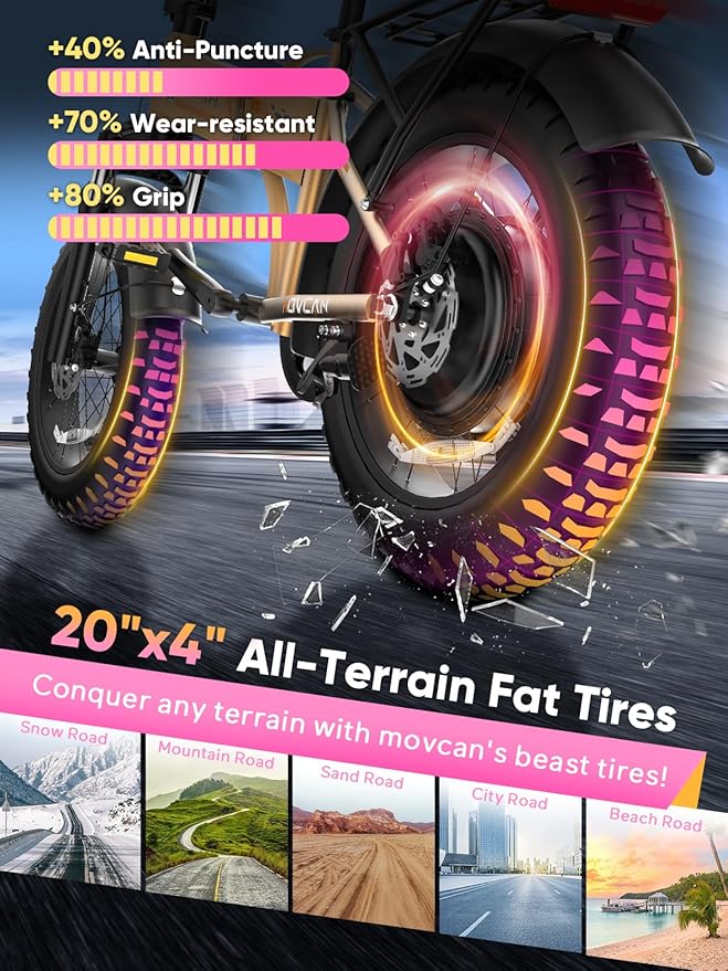 - 【20"x4" Multi-Surface Tires & NFC-Enabled Display】Equipped with 20"x4" fat tires, the Movcan Q20 fat tire electric bike for adults provides reliable traction on pavement, packed trails, and wet surfaces. The tread pattern minimizes rolling resistance while preventing debris buildup. A waterproof LCD display shows real-time speed, battery percentage, and distance traveled. NFC card authentication adds theft deterrence. Suitable for year-round commuting in rain or light snow