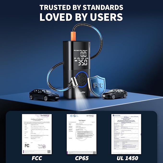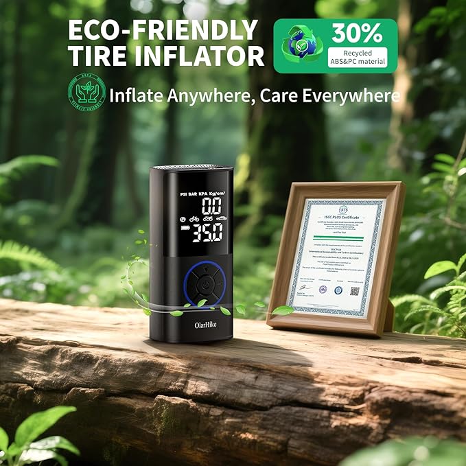 - 【ECO-FRIENDLY】Certified to ISCC standards, the OlarHike Tire Inflator Portable Air Compressor meets strict sustainability requirements. By choosing this eco-conscious design, you support reduced carbon impact and responsible resource use, while still enjoying reliable inflation performance wherever you go