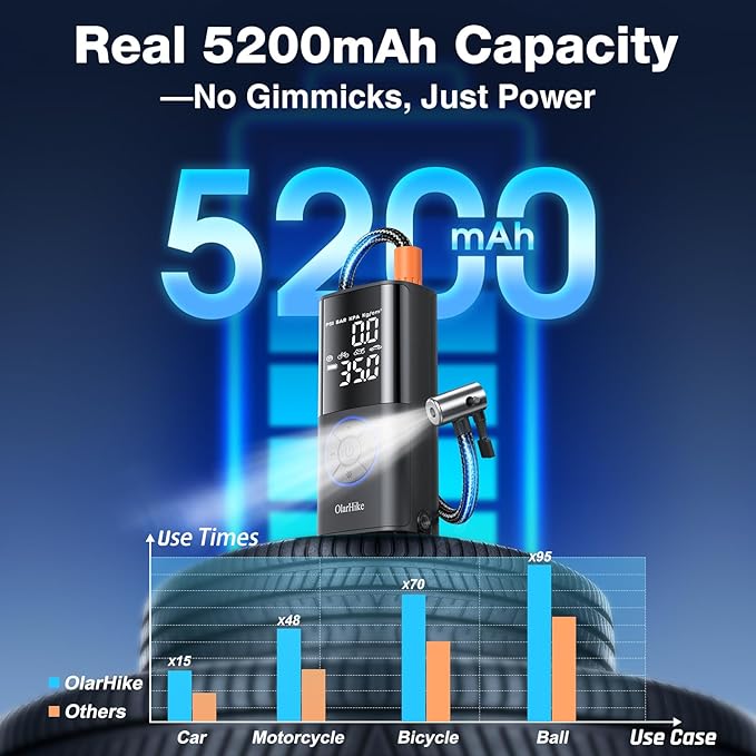 - 【FAST & EFFICIENT INFLATION】The OlarHike portable air compressor is your go-to emergency solution on the road. With its powerful motor, it inflates a 195/65/R15 car tire from 30 to 35 PSI in just one minute. For a 255/45/R19 electric SUV tire, it raises the pressure from 35 to 42 PSI in only four minutes, ensuring you're back on the road quickly