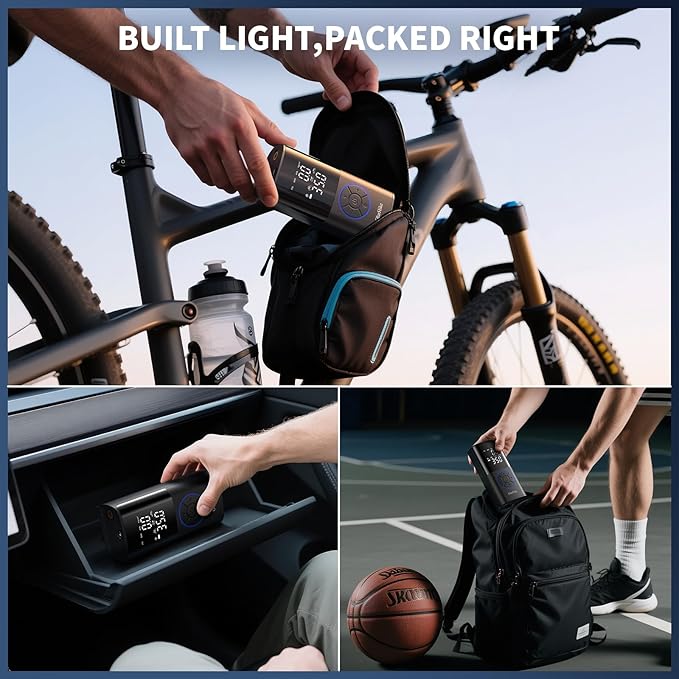 - 【PORTABLE AND CORDLESS DESIGN】 The OlarHike portable air pump features a compact, cordless design and weighs only 0.95 pounds, making it easy to carry wherever you go. It supports four pressure units (PSI, BAR, KPA, ang kg/cm²) to suit your needs. Equipped with multiple attachments and a built-in LED emergency light for low-light situations, it's an essential tool for drivers, cyclists, and adventurers