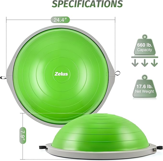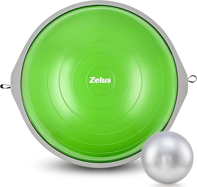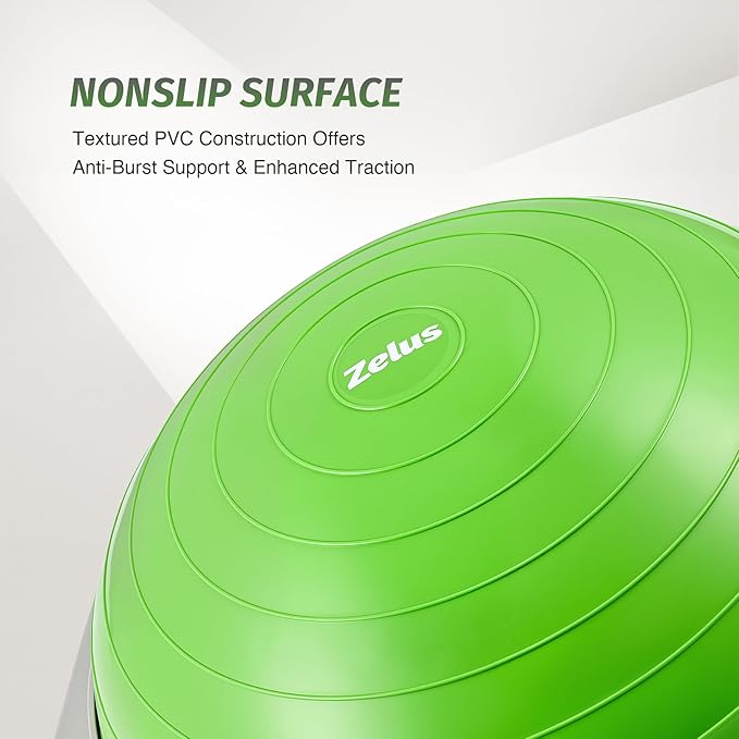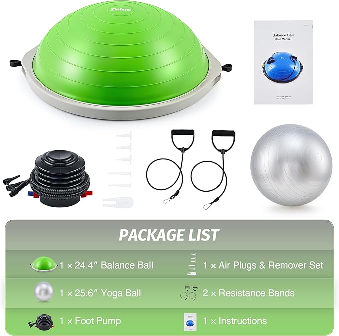 ZELUS 25in. Balance Ball | 660lb Inflatable Half Exercise Ball Wobble Board Balance Trainer w Nonslip Base | Half Yoga Ball Strength Training Equipment w 2 Bands, Pump, Extra Ball Included