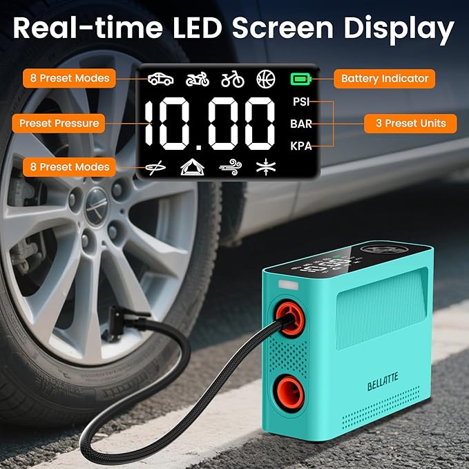 - [High-Speed SUP & All-in-One Portable Powerhouse] This paddle board pump electric portable powerhouse features a robust 120W dual-motor design (brushless + brushed), achieving 80,000 RPM for unmatched efficiency and 98% longer lifespan. Dominate inflation from 0-150 PSI for everything: your SUP, car, bike, balls, tent, kayak, and more. Bellatte 's LD-2301 Air Pump delivers reliable, rapid inflation anywhere.