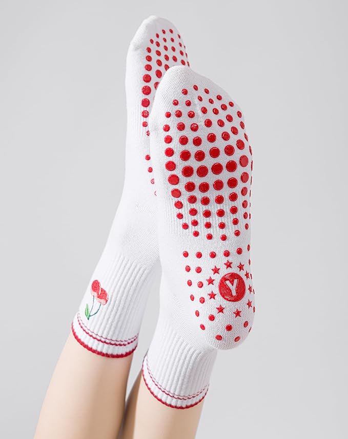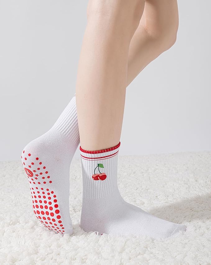 - 【Fashionable Cherry and Stripe Design】 This Pilates sock is adorned with a unique cherry element, featuring lifelike red cherry patterns that add a pop of color and symbolize sweetness and vitality. The red stripes, on the other hand, create a visual effect that elongates the leg line, making your legs appear more slender. The overall design ensures you feel fashionable even while exercising.