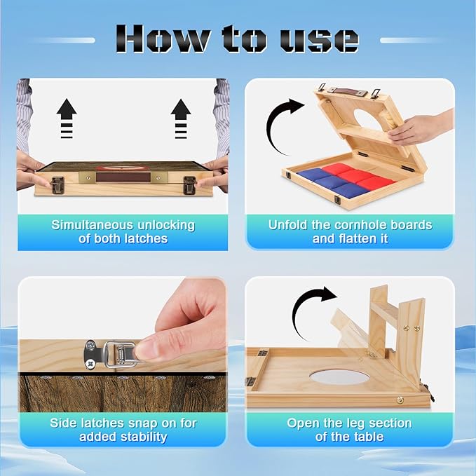 - Easy to Use- Corn hole game Set:The cornhole board simply needs to be opened and the side latch fastened to start the game. Each board has a handle for easy carrying. When taken out of the box, the cornhole game set is ready to play. Can you take it with you wherever you go