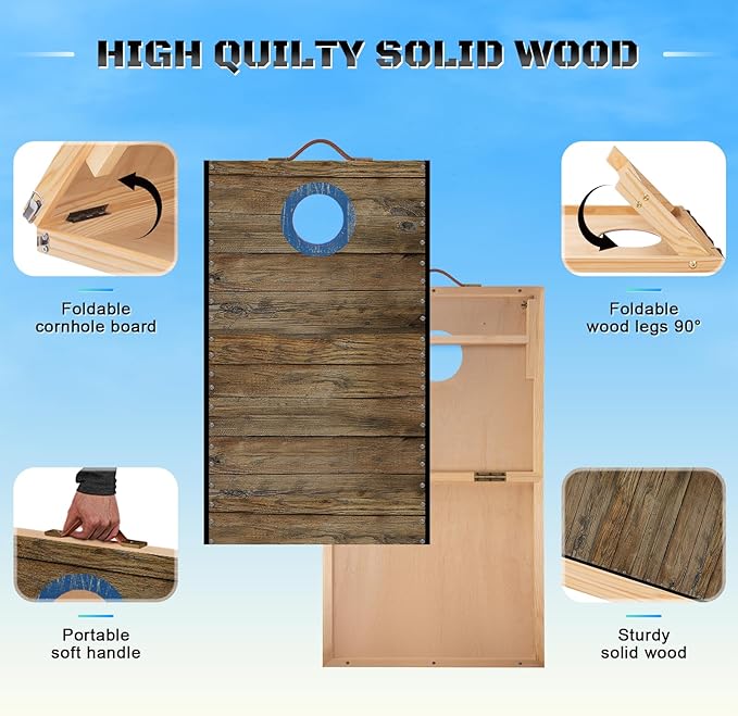 - Folding Design for Easy Carrying:Crafted from solid wood, these cornhole boards feature a foldable design, reducing their size by half for ultimate portability and space-saving storage. Perfect for travel, they fit effortlessly into your trunk and are lightweight enough to carry by hand—ideal for travel, picnics, or backyard fun