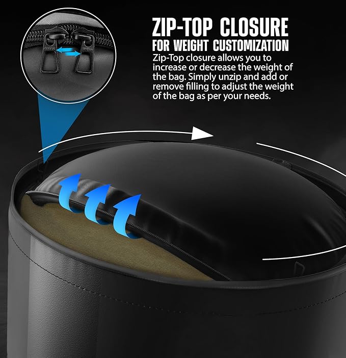 - HEAVY DUTY ZIPPER FOR WEIGHT CUSTOMIZATION–Want one bag for strength conditioning or power building? The RDX Uppercut Bag features a heavy‑duty zipper for precise weight customization. This bag comes with a prefilled weight of 22kg but can be further filled up-to a maximum capacity of approximately 26kg. Simply unzip to add or remove inner filling and adjust the weight according to your strength level or training focus. So Arm yourself with an RDX body bag to train and conquer each session!