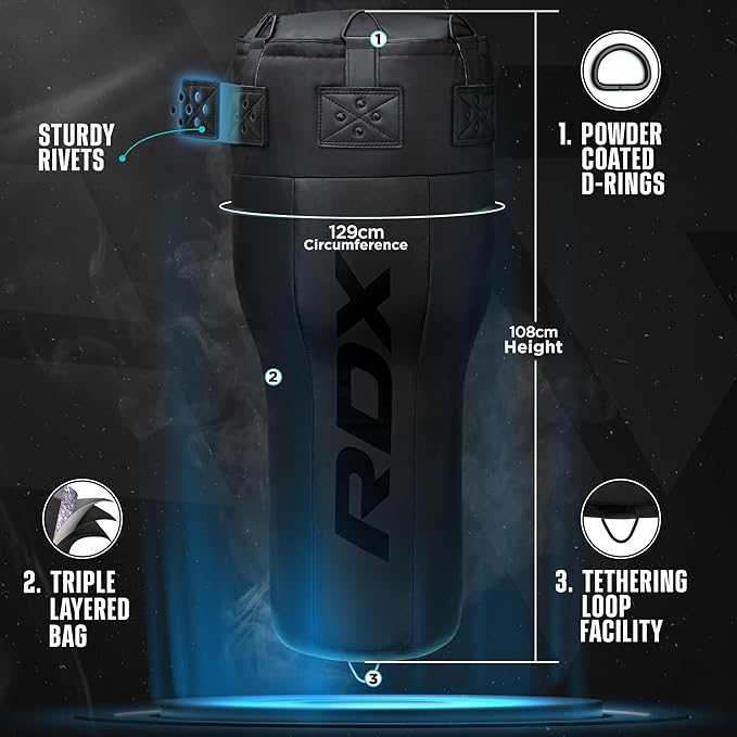 - 22KG STABILITY FOR POWER DEVELOPMENT–Need a heavy bag to unlock your true strength? The RDX heavy boxing uppercut punch bag is approx. 3.5FT (108cm) tall with 130 cm top circumference. These broad dimensions provide a wide striking area that lets you land precise uppercuts and body shots. The 22kg (approx.) prefilled weight provides ideal resistance, helping you drive power from your legs through your hips into each shot. So, build strength and be the hero of your story with RDX!