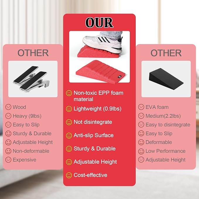- 【Best Material & Universality & Portability】 - Recyclable, Lightweight, And Sturdy Epp Is More Suitable For Achilles Tendon Stretchers Than Wood Or Metal. It Enables You To Use The Physical Therapy Wedge Kit For Squats, Strengthening Stretches, And Weightlifting To More Effectively Target Muscles. The Use Of Calf Extension Wedges Is Equally Effective For Beginners, Advanced Athletes, And Those Undergoing Physical Therapy. This Lightweight And Compact Set Is A Portable Squat Board That You Can Use At Home, In The Gym, Or Even Outdoors.