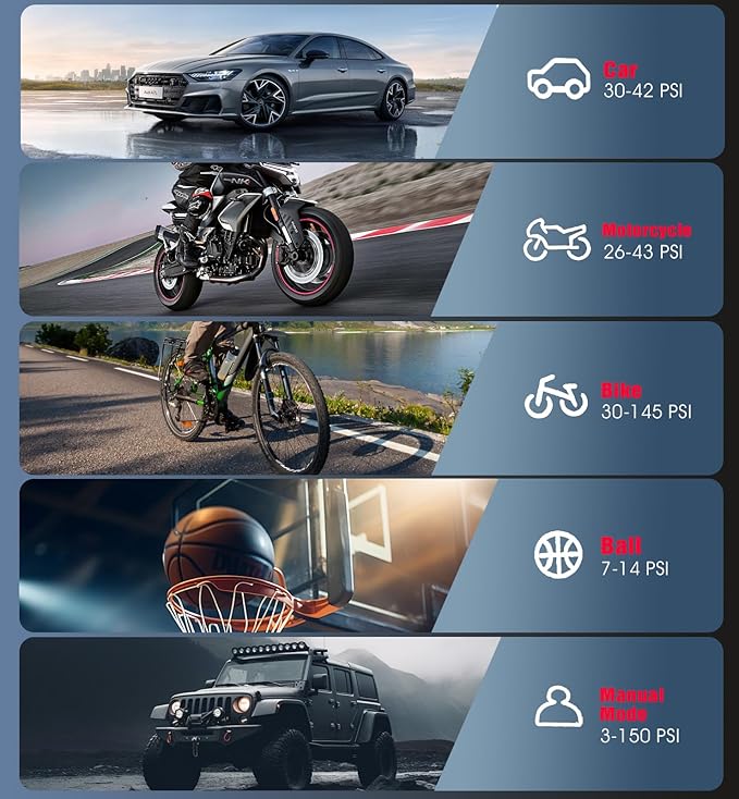 - ๐ใ๐ฐ+๐ก ๐๐ป๐ณ๐น๐ฎ๐๐ถ๐ผ๐ป ๐ ๐ผ๐ฑ๐ฒ๐ใThe Air Compressor has four pressure units: PSI, KPA, BAR, KG/CMยฒ, and four preset inflation modes for bike, motorcycle, car, and ball. You can freely set the pressure of the four preset modes according to your vehicle. in addition, the fifth customized mode allows you to set the pressure value according to the inflated object to get more inflated products. You can easily switch between pressure units with just one button!