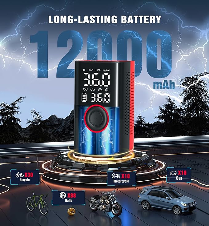 - ๐ใ๐๐ผ๐ป๐ด-๐น๐ฎ๐๐๐ถ๐ป๐ด ๐ฃ๐ผ๐๐ฒ๐ฟ ๐ง๐ถ๐ฟ๐ฒ ๐๐ป๐ณ๐น๐ฎ๐๐ผ๐ฟใThis Portable Air Compressor is powered by a built-in 8000mA rechargeable battery, no need to connect to an external power source during use. It inflates up to three times faster than other ordinary cordless inflators on the market, with 35% more power. Can inflate 7 car tires or 21 bicycle tires, away from the problem of insufficient battery power