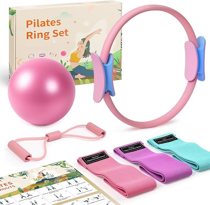 - Pilates ring equipment kit: 1 balanced body pilates ring 14 inch, 9 inch coregeous ball, 3 pilates leg bands, 1 figure 8 elastic stretching bands, and workout guide. This ligas de resistencia para hacer ejercicio can meet the needs of various pilates exercises