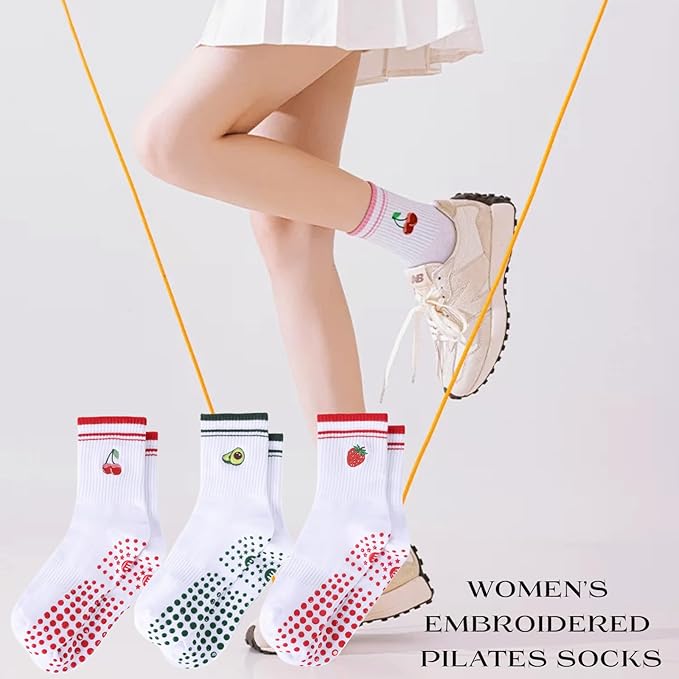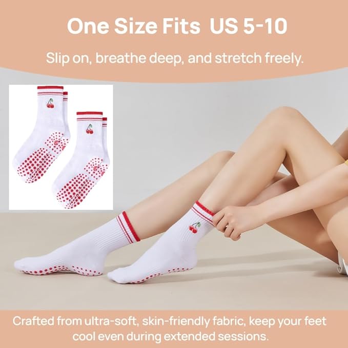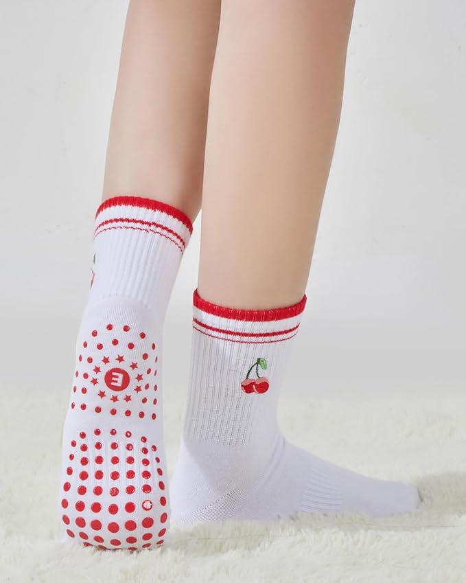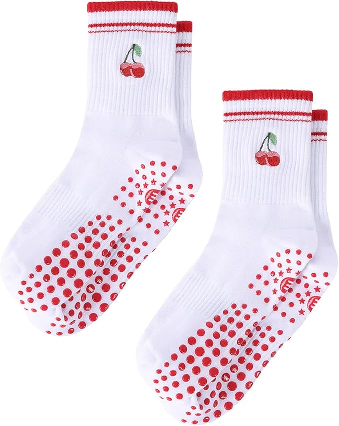 - Anti-Slip Design: Featuring stylish cherry patterns and red stripes, with sticky sole for enhanced stability during workouts and Yoga sessions
