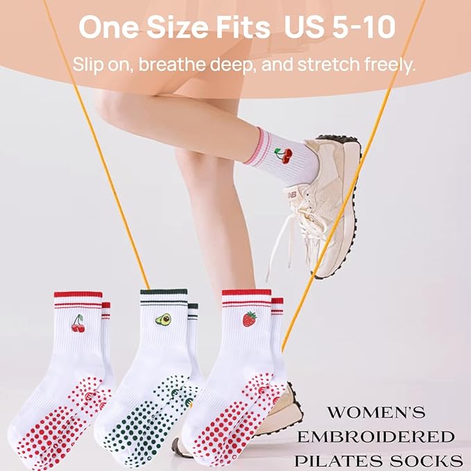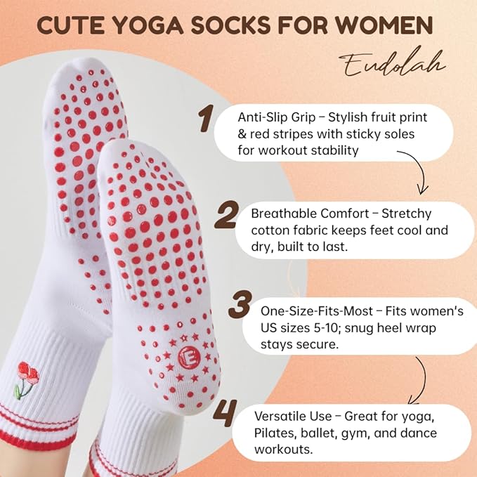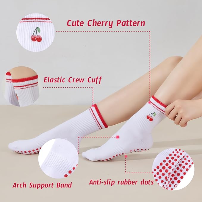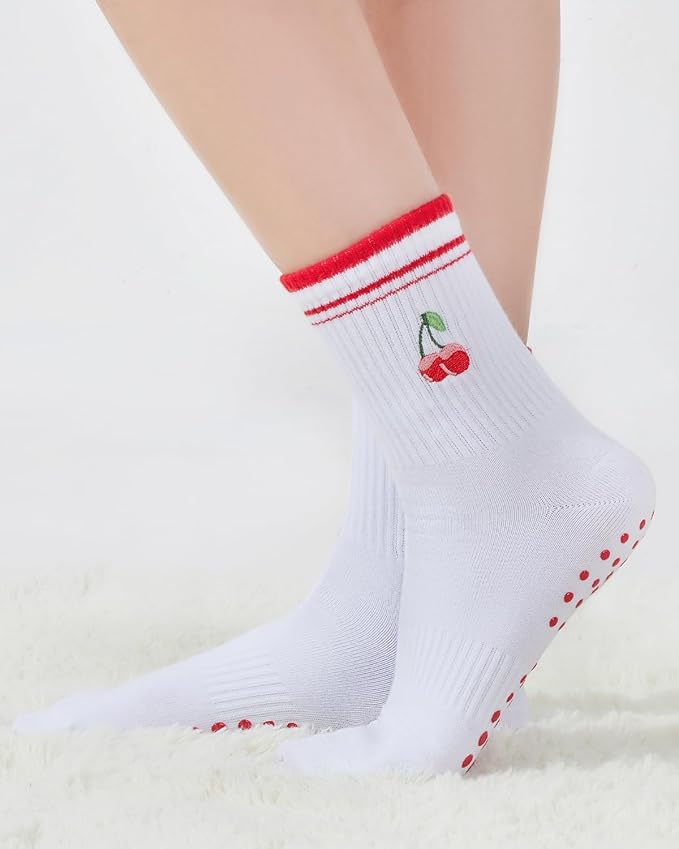 - Anti-Slip Design: Featuring stylish cherry patterns and red stripes, with sticky sole for enhanced stability during workouts and Yoga sessions