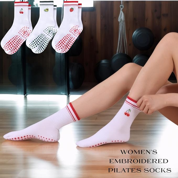 - Anti-Slip Design: Featuring stylish cherry patterns and red stripes, with sticky sole for enhanced stability during workouts and Yoga sessions