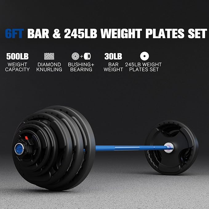 - 【245LB Barbell Set】The set includes a 6-foot barbell with a pair of collars and a set of 245lb weight plates: 2x2.5lb, 2x5lb, 2x10lb, 2x25lb, 2x35lb, 2x45lb. With the barbell included, the total weight adds up to 275lb. These cost-effective equipment are perfect for long-term training use.