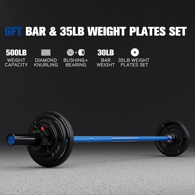 - 【35LB Barbell Set】The set includes a 6-foot barbell with a pair of collars and a set of 35lb weight plates: 2x2.5lb, 2x5lb, 2x10lb. With the barbell included, the total weight adds up to 65lb. These cost-effective equipment are perfect for long-term training use.