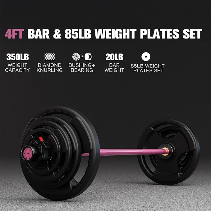 • 【85LB Barbell Set】The set includes a 4-foot barbell with a pair of collars and a set of 85lb weight plates: 2x2.5lb, 2x5lb, 2x10lb, 2x25lb. With the barbell included, the total weight adds up to 105lb. These cost-effective equipment are perfect for long-term training use.